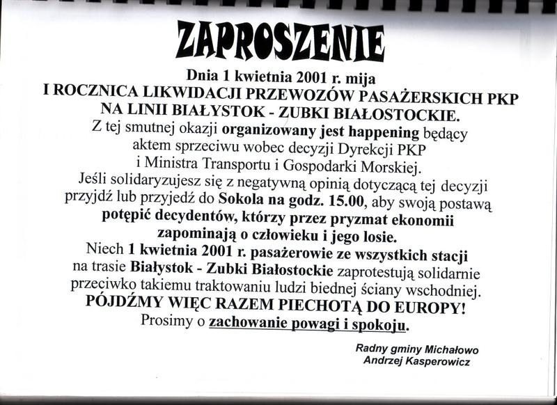 Zaproszenia zostały rozesłane do siedmiu miejscowości przez które przebiega linia kolejowa Białystok - Zubki Białostockie. Zapraszające mieszkańców do wzięcia udziału w organizowanym happeningu w Sokolem w dniu 01.04.2001 r.