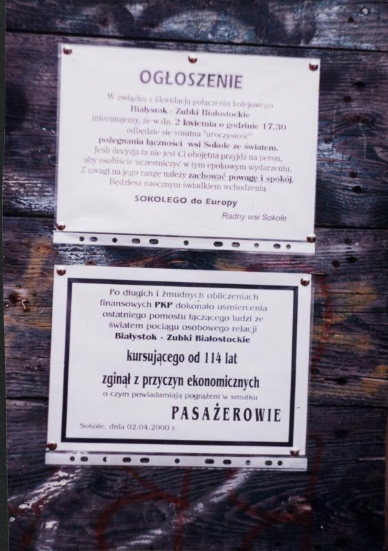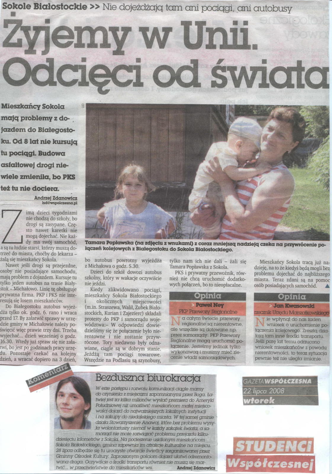 Sokole BIałostockie od 8 lat jest odcięte od świata, mimo, że żyjemy w Unii. Od zamknięcia linii PKP Białystok-Zubki Białostockie minęło już 8 lat, a mieszkańcy wsi Sokole nadal są odcięci od świata, mimo że Polska jest od 1 maja 2004r w Unii Europejskiej. Mieszkańcy walczą nieprzerwanie z PKP i samorządem województwa o ponowne uruchomienie pociągu na tej trasie, ale bezskutecznie. Władza jest bezduszna i biurokratyczna oraz głucha na problemy mieszkańców wsi Sokole i okolicznych miejscowości położonych wzdłuż trasy PKP Białystok-Zubki Białostockie.Artykuł w Gazecie Współczesnej ukazał się w 48 rocznicę otwarcia przystanku PKP w Sokolem i 8 rocznicę zamknięcia tej linii PKP.