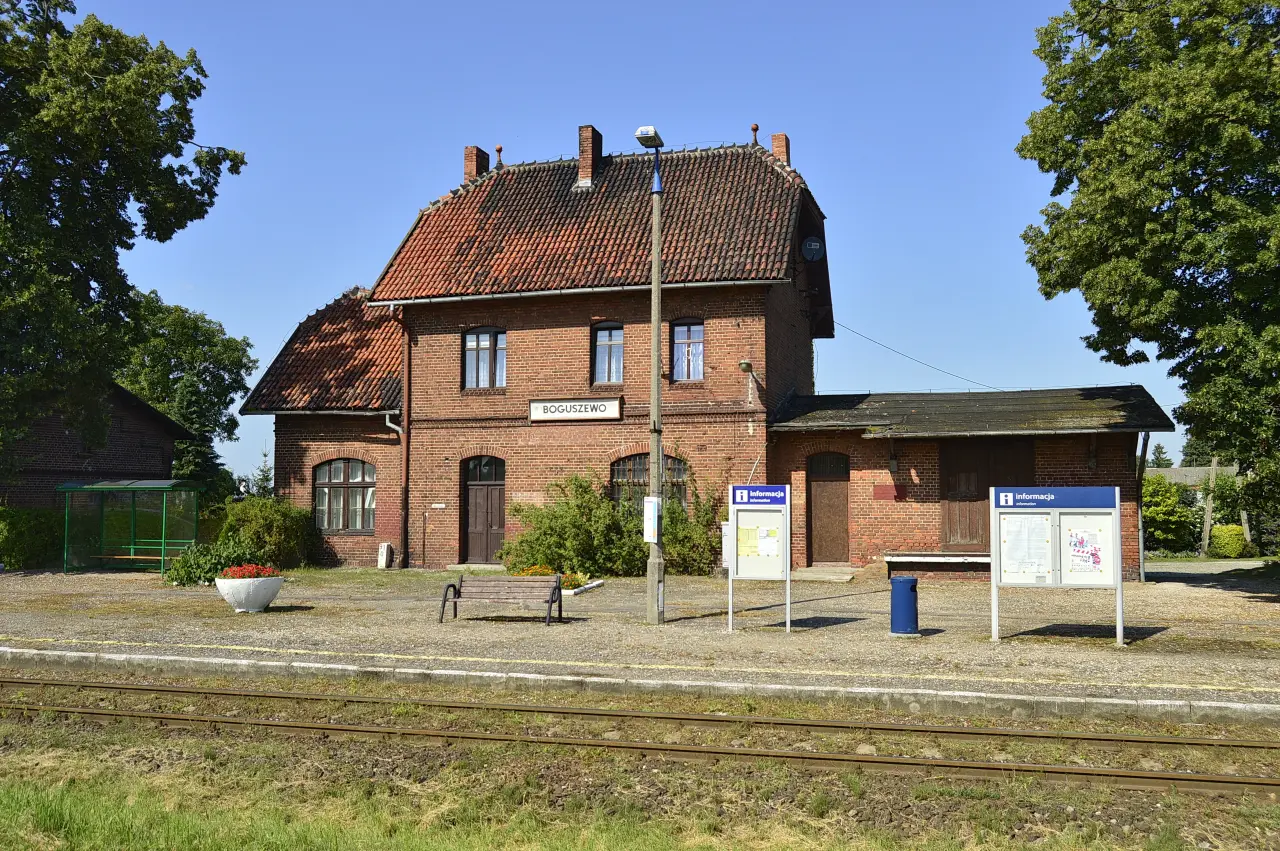 Kolejowy budynek mieszkalny (Boguszewo 21) i budynek dworcowy z przyległym budynkiem magazynu. Obiekty widoczne od strony torów. W lewo Grudziądz/Chojnice, w prawo Jabłonowo Pomorskie/Działdowo.