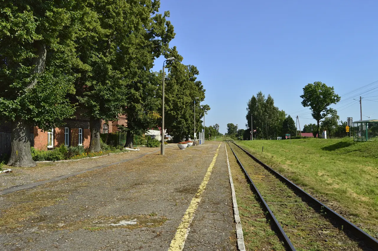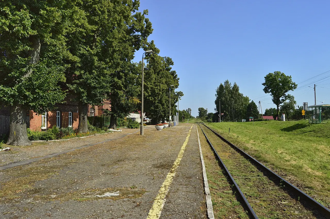 Widok na peron i w kierunku Grudziądza/Chojnic. Budynek dworcowy z przyległym budynkiem magazynu, znajduje się po prawej stronie.