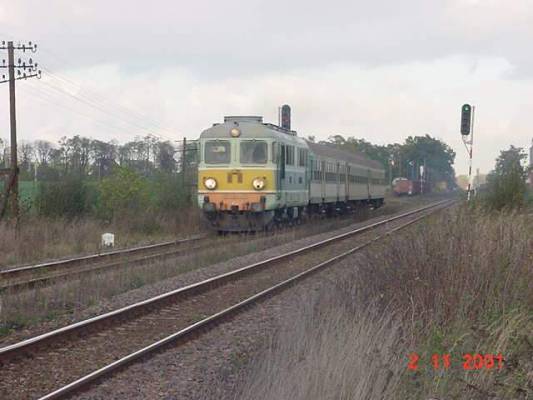 Pociąg osobowy relacji Kędzierzyn Koźle - Jaworzyna Śląska wyjeżdża ze st. Goświnowice w kierunku Kamieńca (numeru nie pamiętam ale to było około 14-14.30). Zielone światło na drugim torze - za chwilę wjedzie skład z wagonami zbożowymi do goświnowickiego elewatora.
