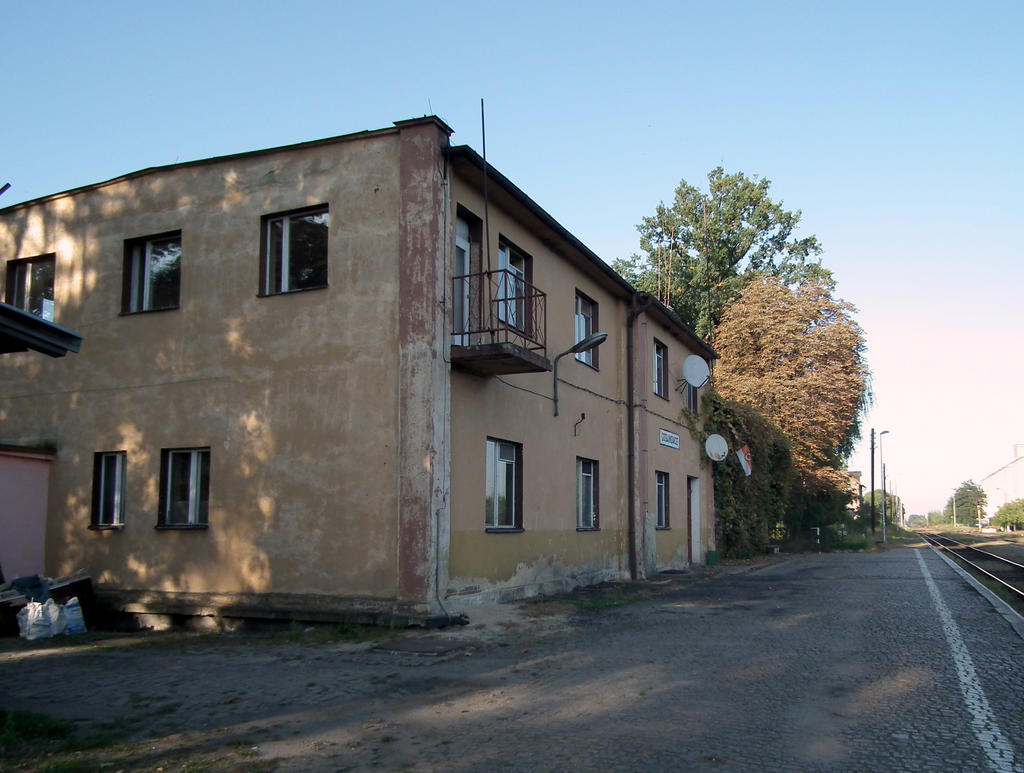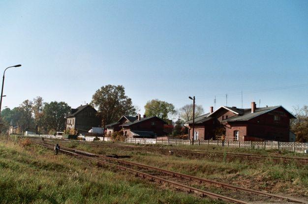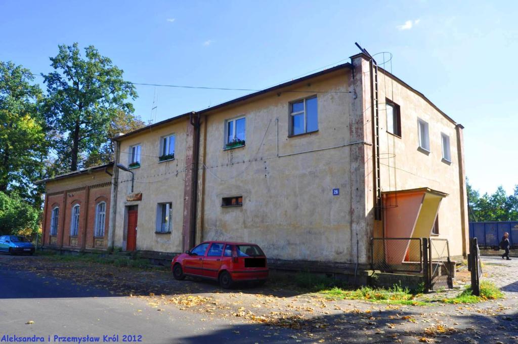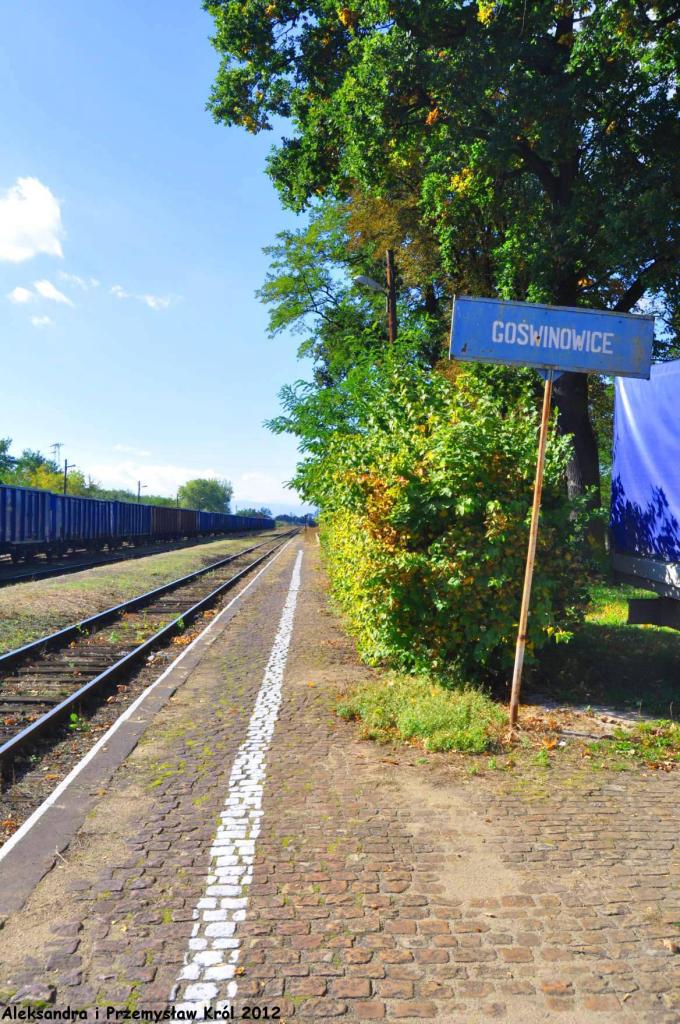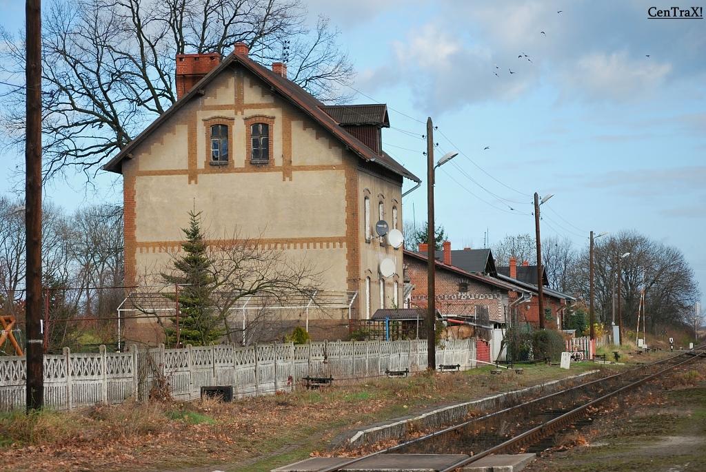Bardzo ogólny widok na stację oraz budynki otoczenia stacji kolejowej w Goświnowicach.