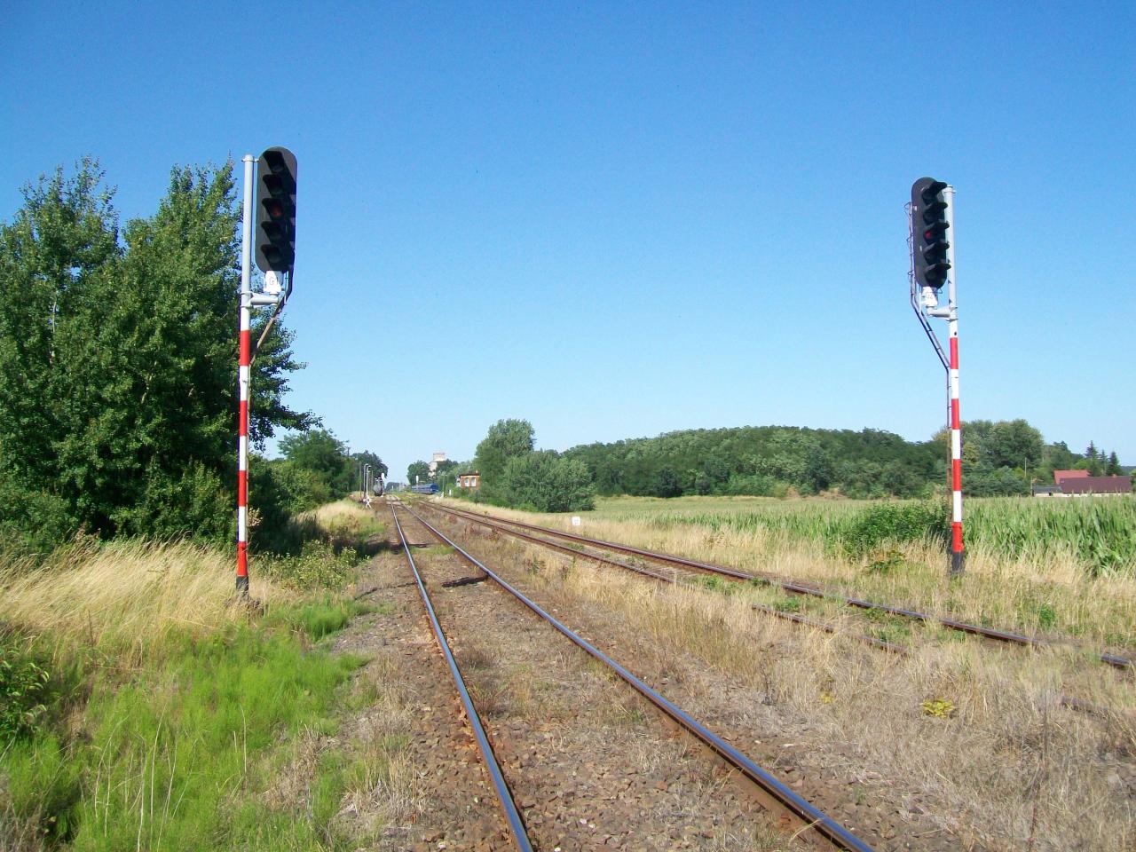 Semafory wjazdowe od strony Otmuchowa. W tle równia stacyjna i nastawnia wykonawcza. Widok w kierunku północno-wschodnim.