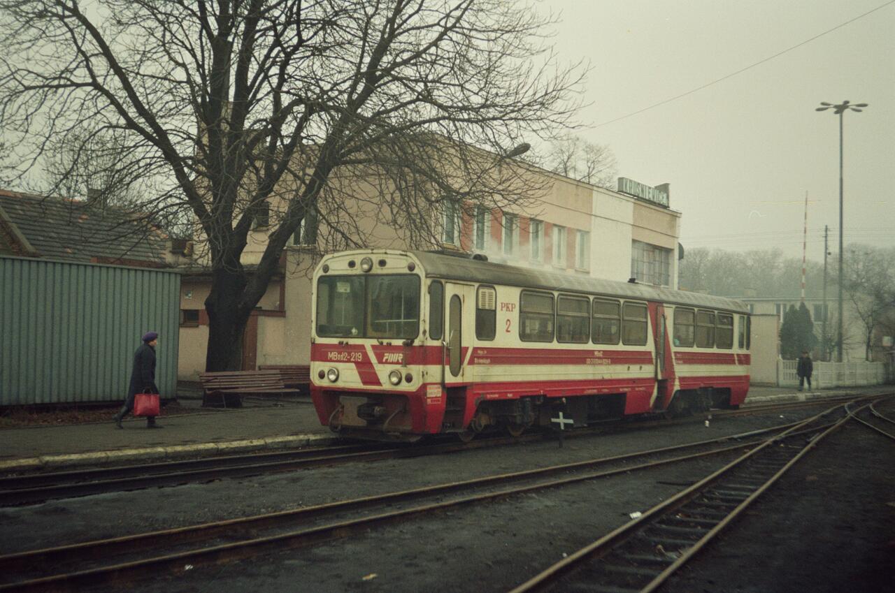 Stacja Krośniewice - pociąg MM 70125 relacji Boniewo - Krośniewice, obsługiwany wagonem spalinowym MBxd1-204 wjeżdża na stację docelową. Widok w kierunku stacji Boniewo (tor odchodzący w lewo), Ostrowy Wąskotorowe (tor odchodzący w prawo).