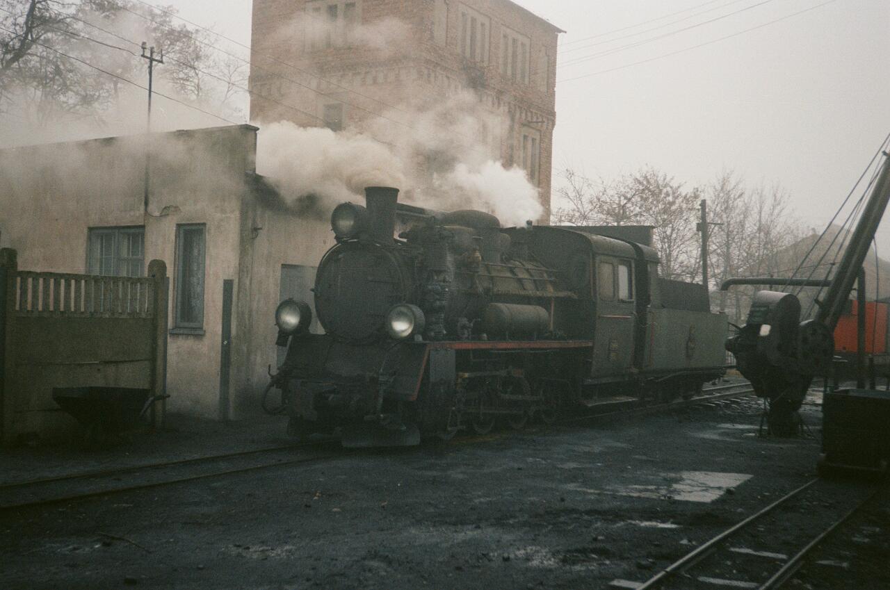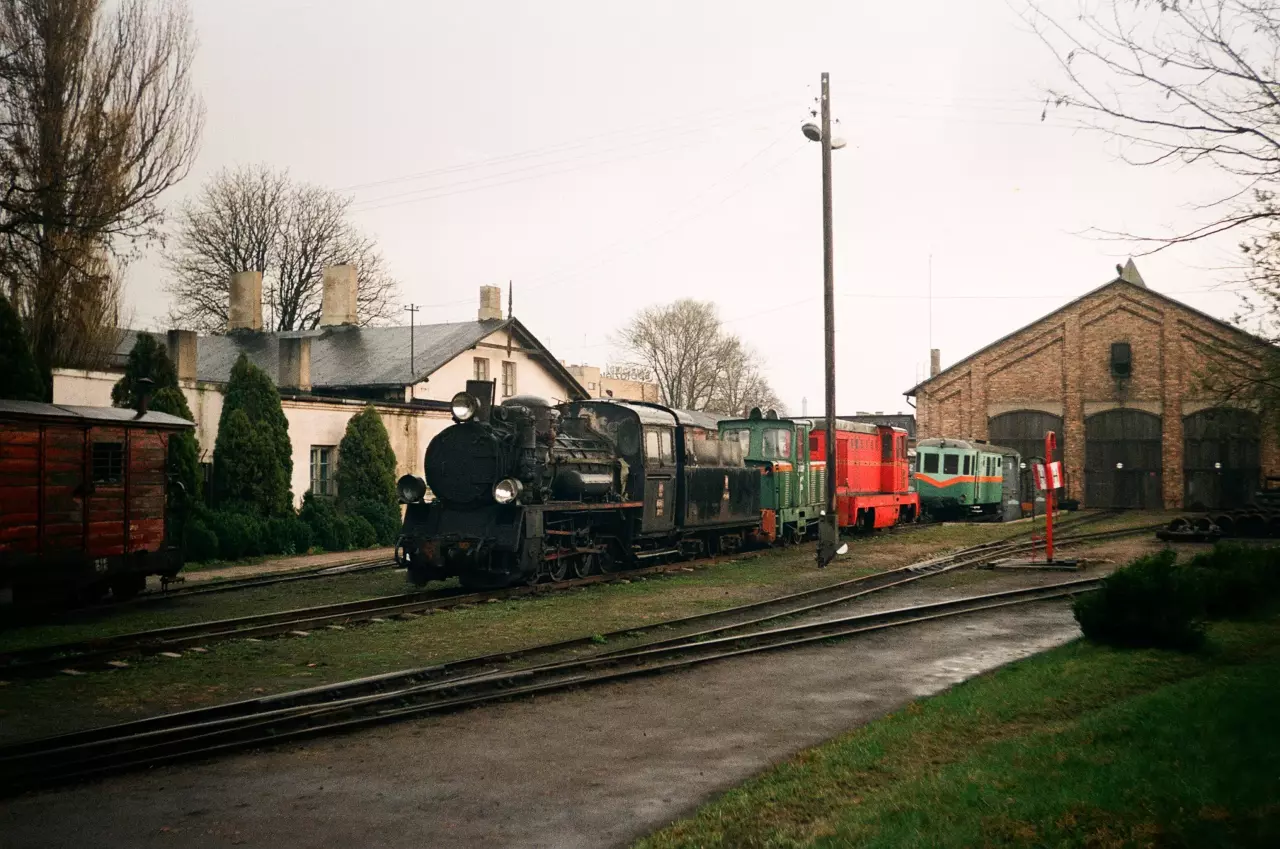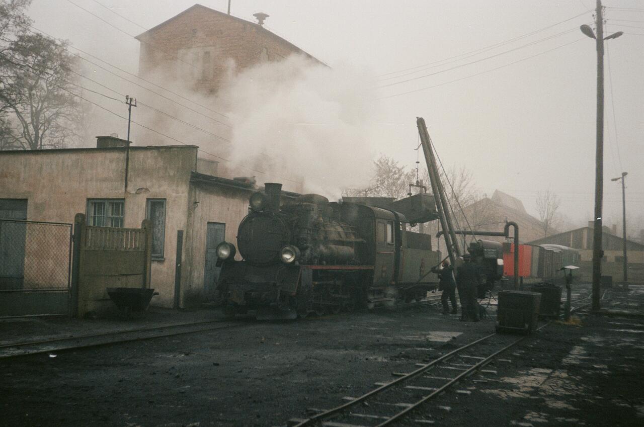 Stacja Krośniewice - parowozownia, parowóz Px48-1912 w oczekiwaniu na zatrudnienie, widok w kierunku stacji Ozorków Wąskotorowy.