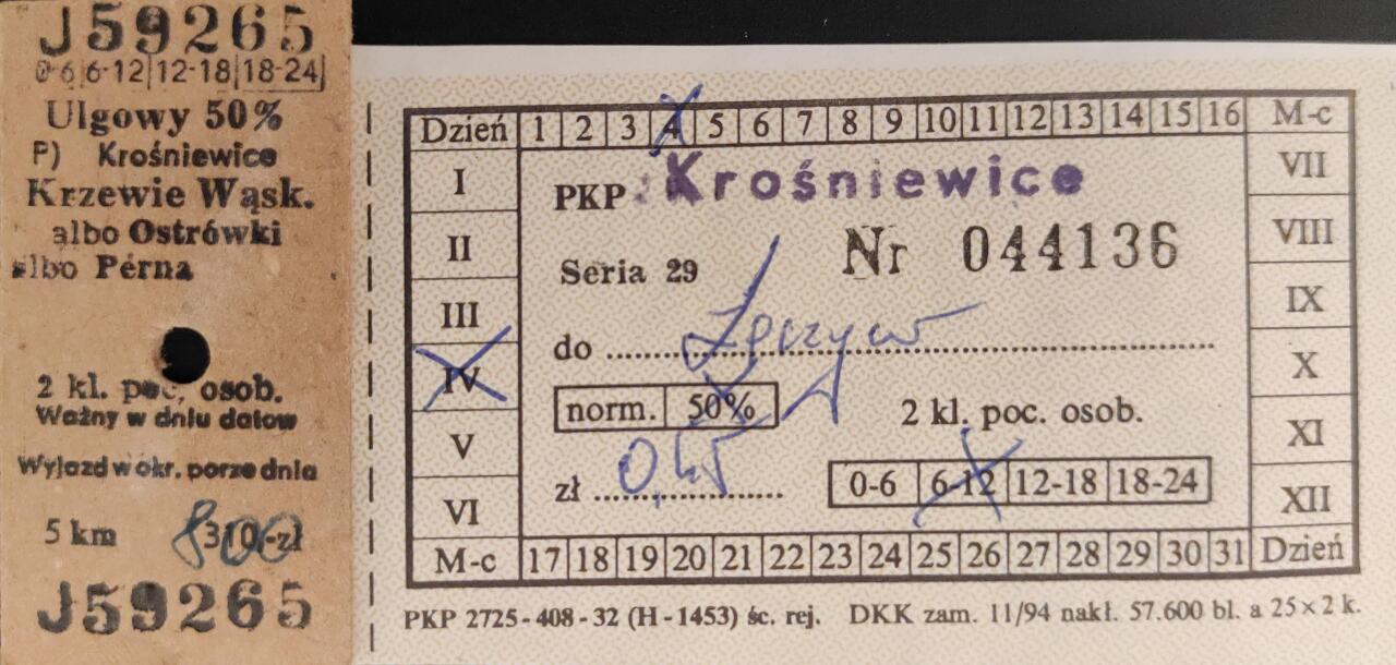 Bilet kartonowy wydany w kasie biletowej stacji Krośniewice w dniu 31 stycznia 1992 roku, bilet blankietowy wydany w kasie biletowej stacji Krośniewice w dniu 4 kwietnia 1995 roku.