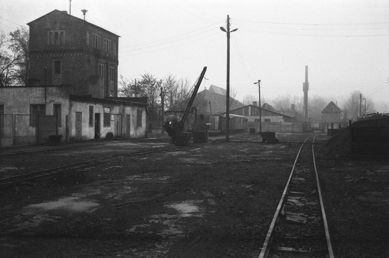 Stacja Krośniewice - stanowisko do nawęglania i wodowania parowozów, wieża wodna. Widok w kierunku stacji Ozorków Wąskotorowy.