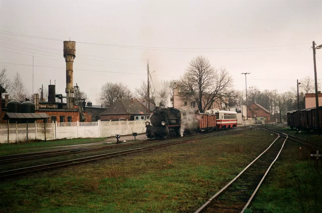 Stacja Krośniewice - parowóz Px48-1912 ze składem pasażerskim w oczekiwaniu na zatrudnienie, widok w kierunku stacji Ozorków Wąskotorowy.