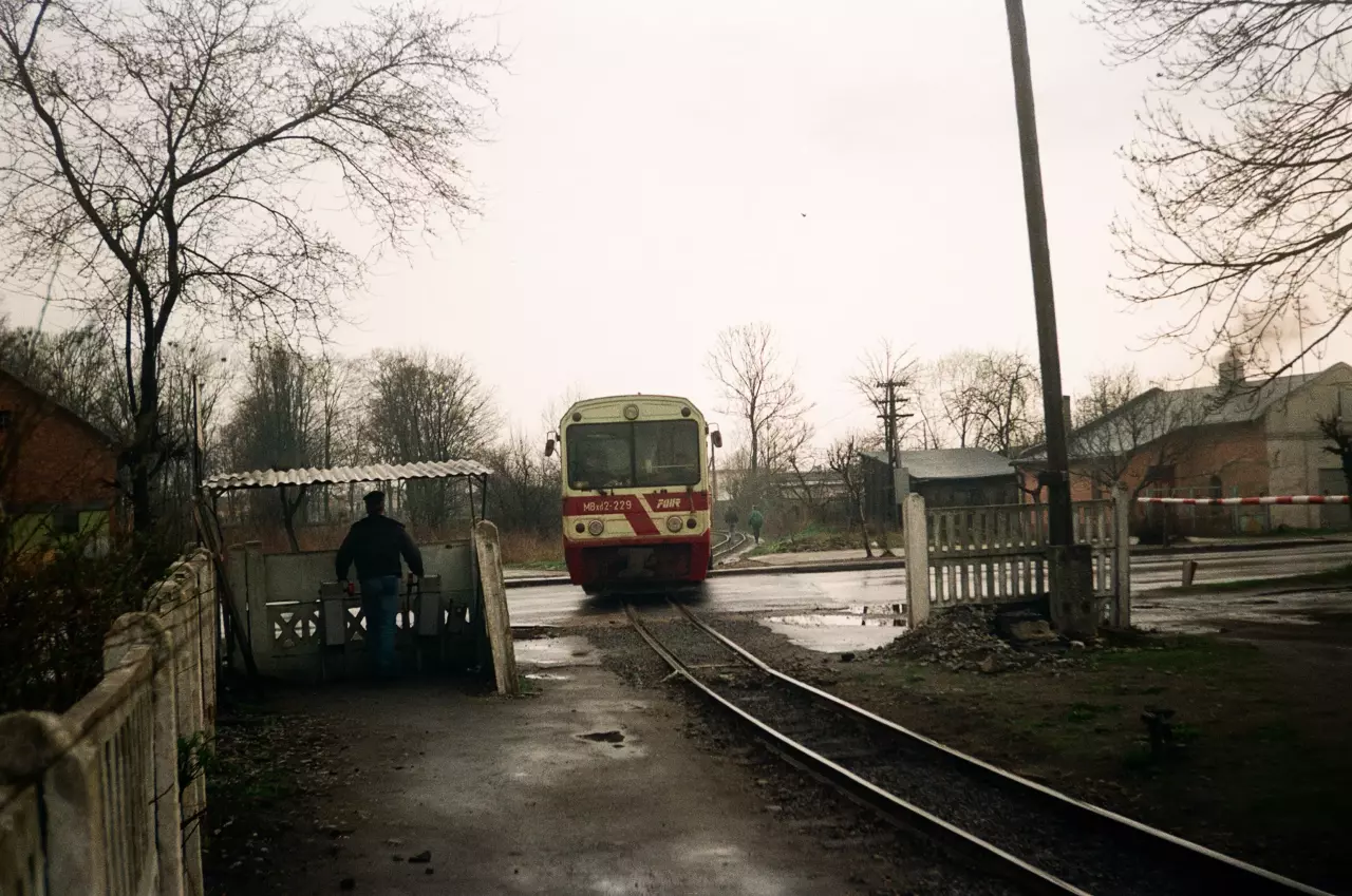 Stacja Krośniewice - przejazd kolejowy z ulicą Poznańską - droga krajowa nr 2 (E30), pociąg MM 7010 relacji Ozorków Wąskotorowy - Krośniewice, obsługiwany wagonem spalinowym MBxd2-229 wjeżdża na stację docelową, widok w kierunku stacji Ozorków Wąskotorowy.