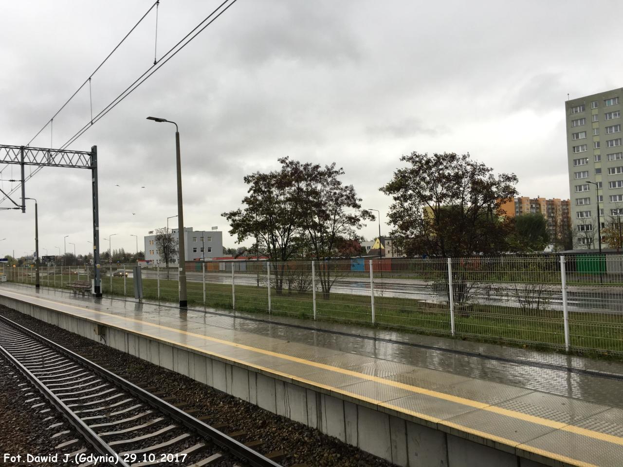 Stacja Bydgoszcz Bielawy w deszczowy poranek. Widok w kierunku Bydgoszczy Wschód.