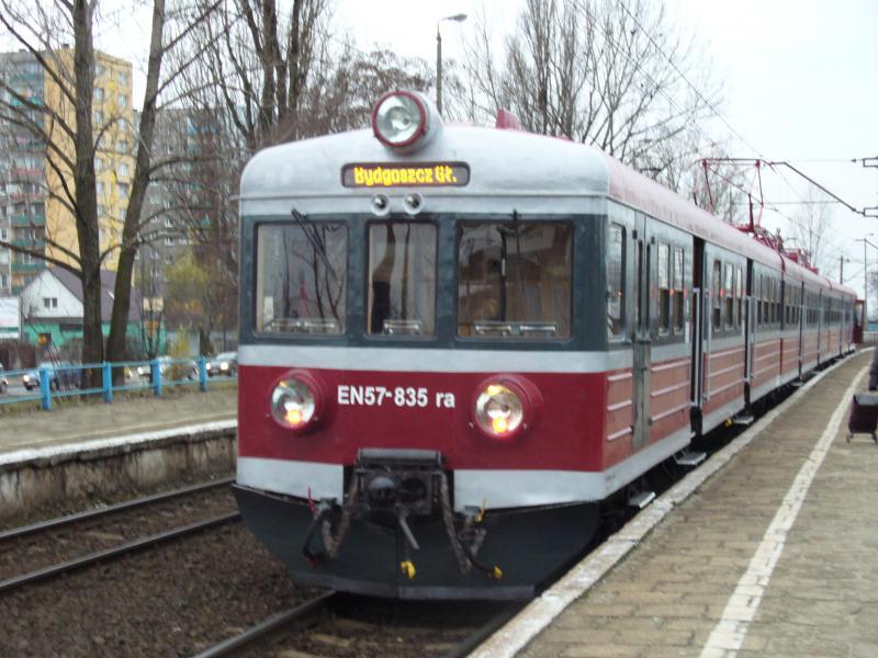 Odnowiony EN57-835, jako osobowy relacji Kutno - Bydgoszcz Główna na przystanku Bydgoszcz Bielawy. Widok w kierunku Bydgoszczy Głównej i Maksymilianowa.