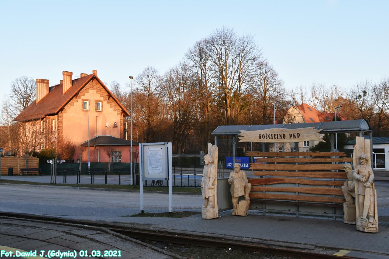 Przejeżdżając dziś pociągiem przez stację w Gościcinie miałem dziwne wrażenie, że czegoś tam brakuje... Z przykrością muszę stwierdzić, że brakującym elementem jest budynek stacyjny, który jak się okazuje został niestety zrównany z ziemią. Przeszukując internet można natknąć się zarówno na zdjęcia tego procederu, jak i na informację na jednym z portali (z kwietnia 2016 roku), że dworzec znajduje się na liście obiektów "do kasacji" przez PKP. Taki to więc smutny koniec historii tego dworca...