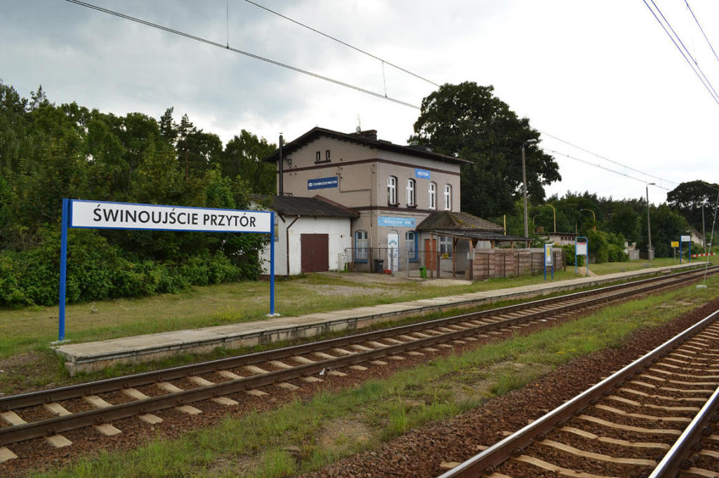Budynek dworca i peron 1 dla obsługi podróżnych udających się w stronę Wysokiej Kamieńskiej/Szczecina (w lewo). W prawo stacja Świnoujście.