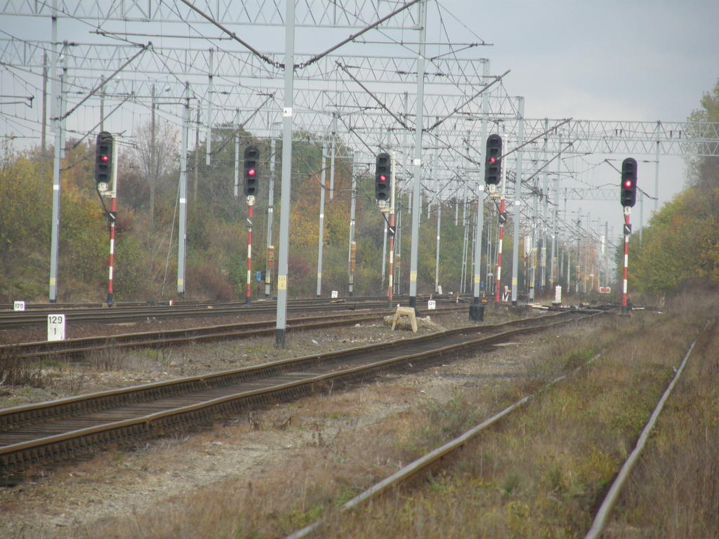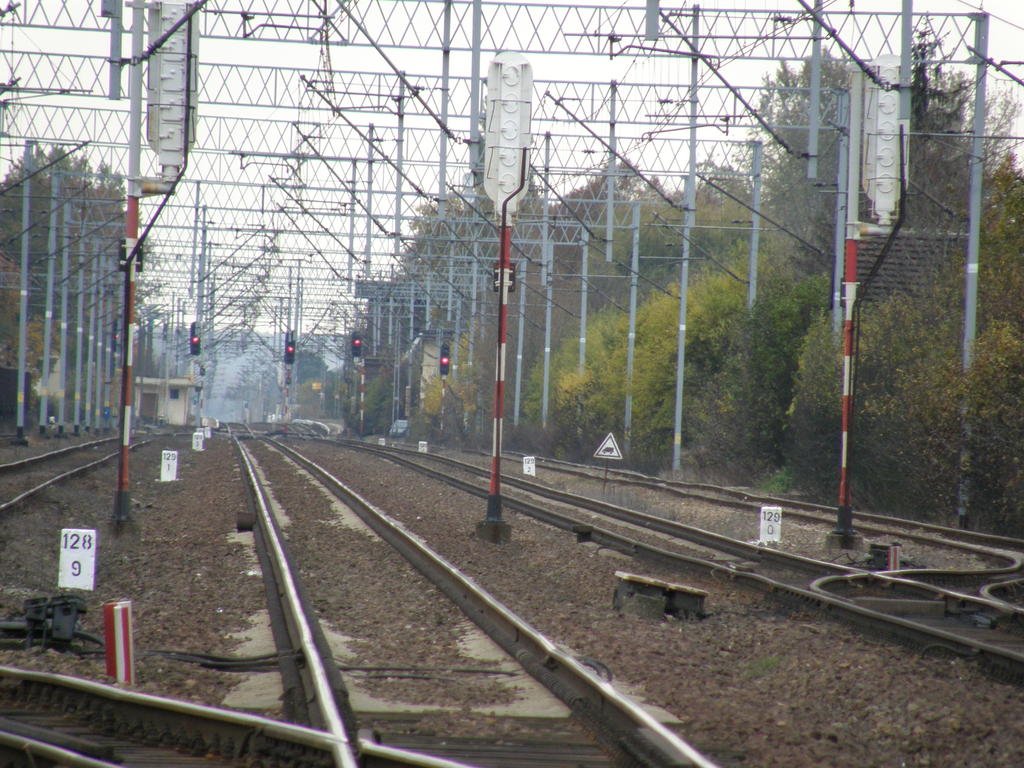 Północna głowica rozjazdowa, wyjazd na Koluszki. Widoczne wszystkie pięć semaforów wyjazdowych. Widok w kierunku Piotrkowa Trybunalskiego. 128,8 km.