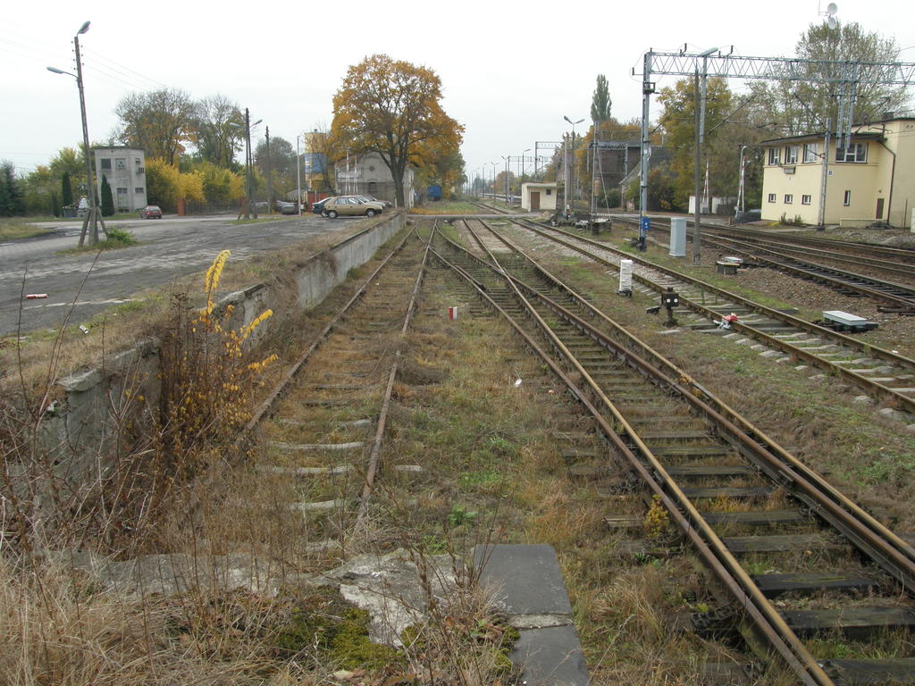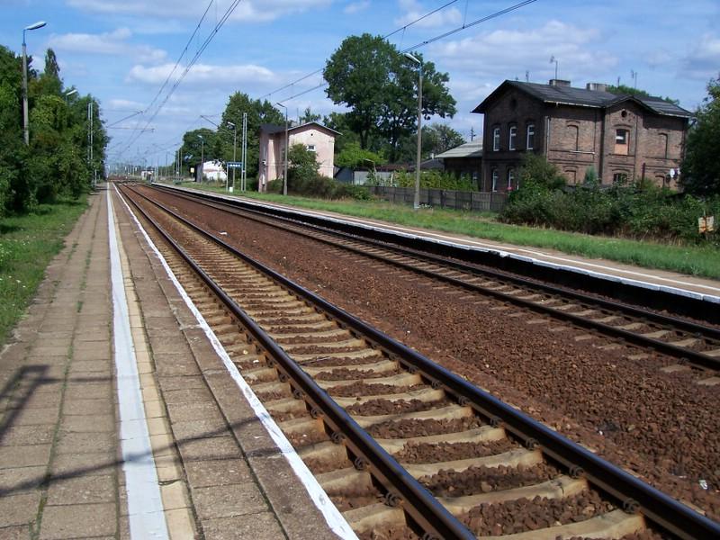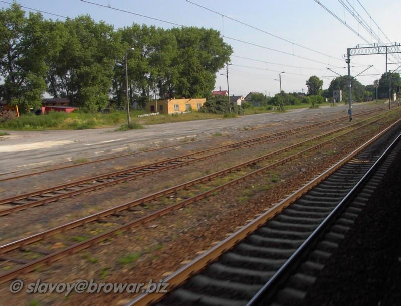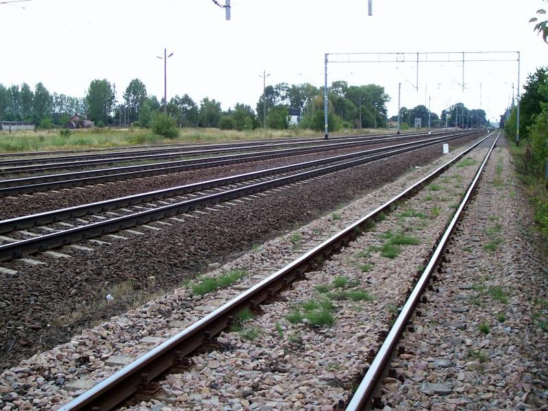 Północna głowica rozjazdowa, wyjazd na Koluszki. Tory stacyjne. Perony znajdują się za głowicą południową. Widok w kierunku Piotrkowa Trybunalskiego. 128,9 km.
