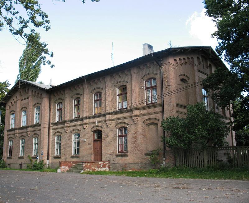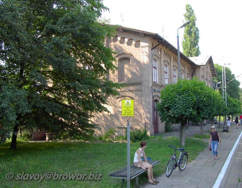 Budynek mieszkalny z tablicą naprzeciw dworca.