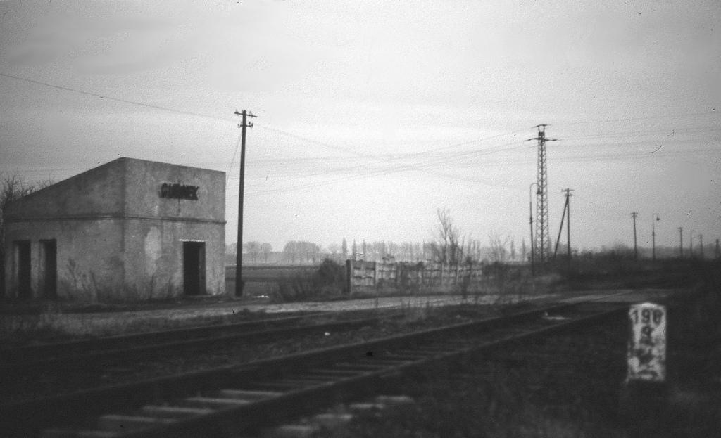 Przystanek Gubinek. Widok z drogi nr 285 Gubin - Grabice - Starosiedle w kierunku Grabic. Kępa drzew osłania poczekalnię w murowanym baraczku stojącą przy prowizorycznym peronie. W prawo granica państwa/Guben i Lubuskie Zakłady Przemysłu Skórzanego "Carina".