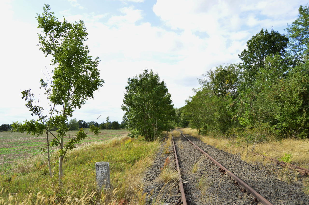 Peron, widok w kierunku Lubska (południowy-wschód). To oszalowany na linii krawędzi nasyp ziemny przy torze mijankowym (dawniej zasadniczym dwutorowej berlinki).