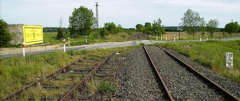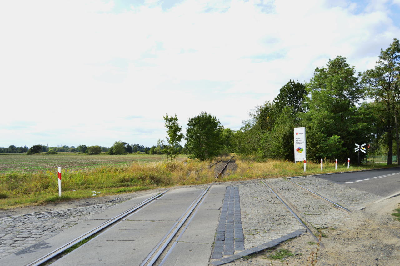 Widok, z punktu 196,915 km wyznaczającego przystanek, w kierunku Lubska (południowy-wschód). Za przejazdem kolejowym z DW 285, po lewej w murowanym baraku, poczekalnia dla podróżnych.