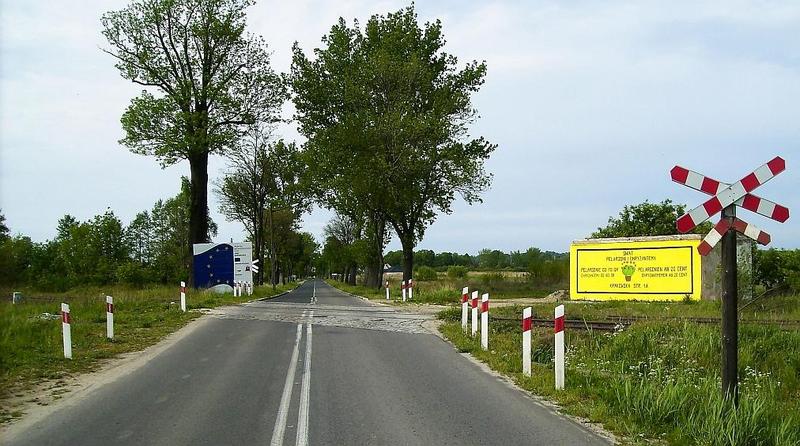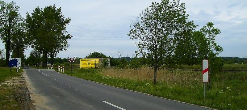 Przejazd kolejowy. Na drodze wojewódzkiej nr 285 Gubin - Grabice - Starosiedle. Widok w kierunku Gubina (północny-wschód), w lewo granica państwa/Guben i Lubuskie Zakłady Przemysłu Skórzanego "Carina".
