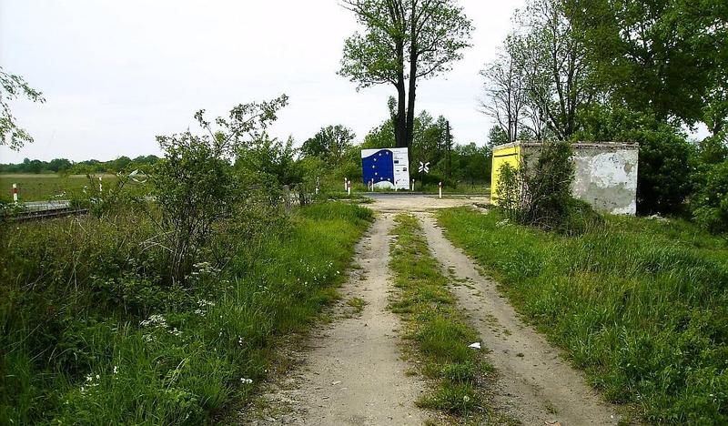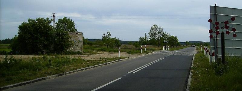 Przejazd kolejowy przez DW 285 i fragment opuszczonego przystanek w Gubinku. Pociągi pasażerskie z Lubska (w prawo) przestały kursować kilka lat wcześniej. Widok w kierunku Gubina (północny-wschód), w lewo granica państwa/Guben i Lubuskie Zakłady Przemysłu Skórzanego "Carina".