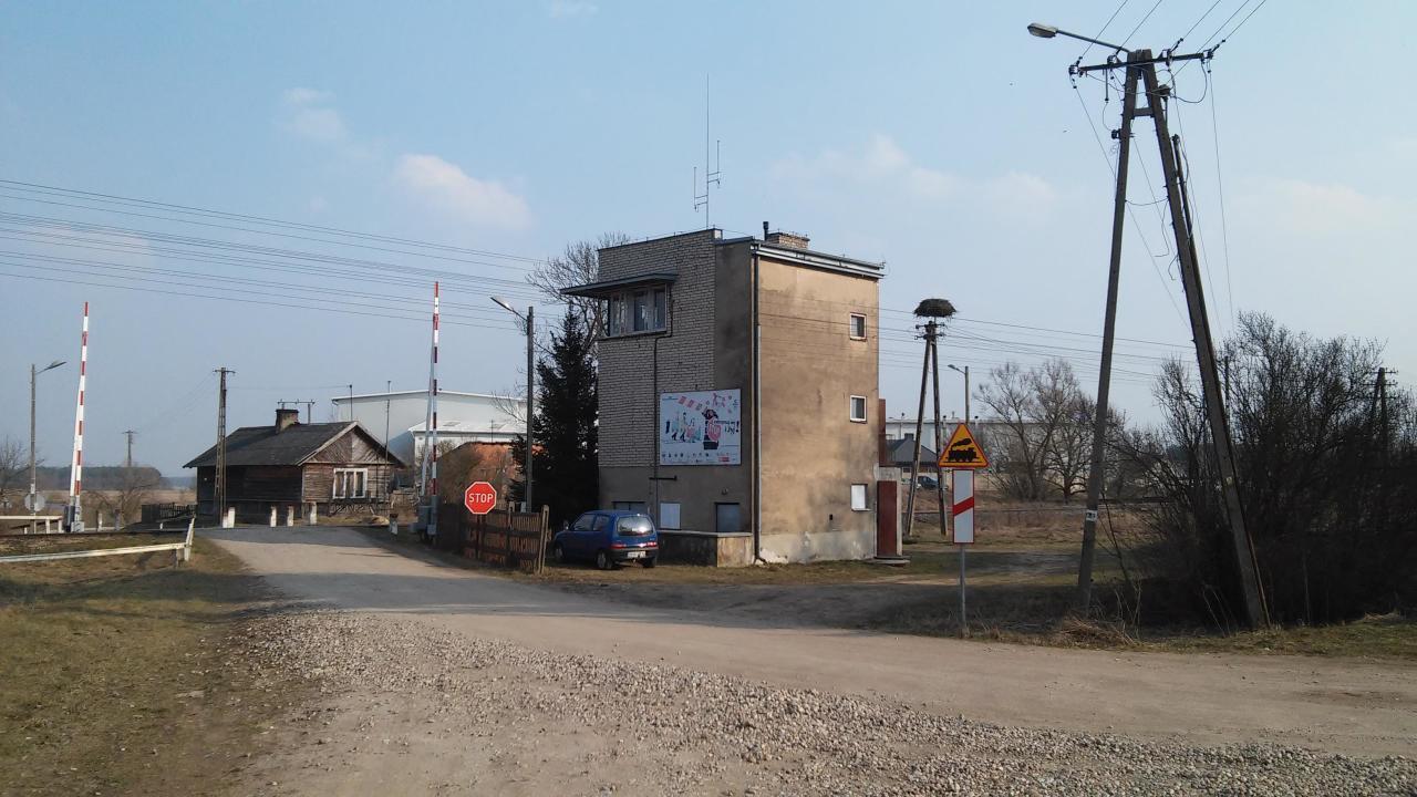 Budynek dawnego posterunku stwierdzenia końca pociągu a obok kontener nowych urządzeń przejazdowych.