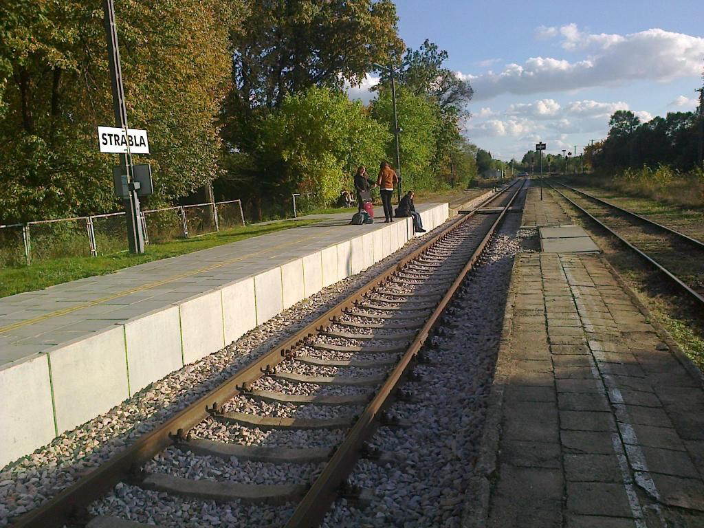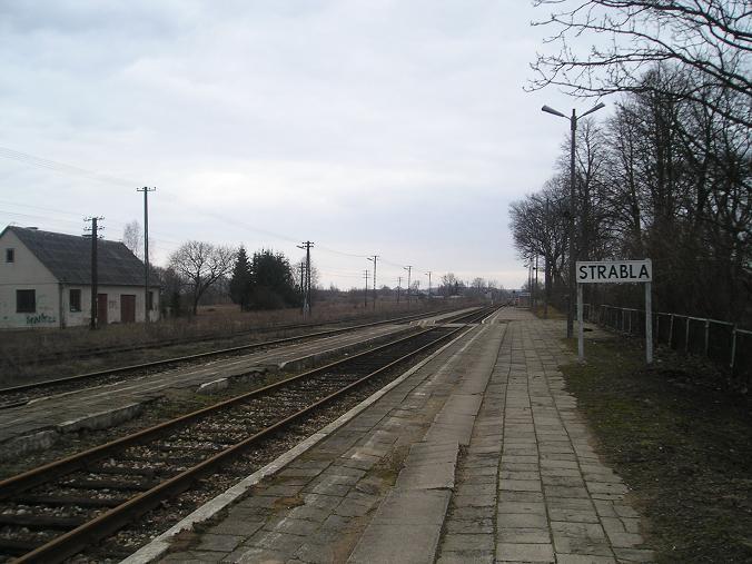 Strabla - widok w kierunku Białęgostoku. Stoję na peronie - w oddali widoczna nastawnia (czynna) oraz rząd semaforów. Niebieskie światełka na tarczach oznaczają zakaz jazdy manewrowej. Zamkniety tor po prawej prowadzi do rampy. Stacja w miarę zadbana. oświetlenie sprawne.