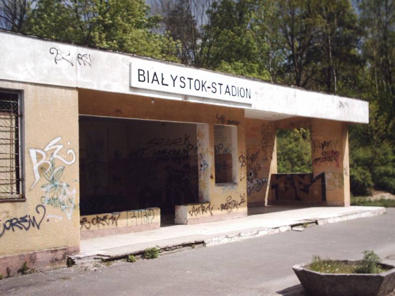 Na tej stacji, a właściwie przystanku, jest tylko jeden peron, jedna krawędź i jeden tor. Co prawda kilkaset metrów wcześniej jest drugi tor i zwrotnica łącząca go z głównym, ale jest to bocznica prowadząca do jednostki wojskowej. (info: rowerzyk, 2006-02-15) Ww 1973 roku z okazji z powodu Ogólnopolskich Dożynek powstał w pobliżu przystanku stadion piłkarski na 30 tyś. miejsc, który należał do klubu G.K.S. "Gwardia" (obecnie jest to stadion miejski). Stąd też pochodzi nazwa przystanku "Białystok Stadion". To tu wysiadali uczestnicy dożynek udający się na uroczystości dożynkowe. Głośniki zdemontowane latarnie rozłączone wszystko zamurowane i zlikwidowane. (info: HUMVEEX, 2005-09-12) Ostatnimi czasy zamontowano na przystanku nowe oświetlenie tj. nowe lampy sodowe w miejsce starych rtęciowych. Przystanek jest teraz oświetlony całą dobę. Poza tym postępuje dewastacja budynku. (info: Qbass_87, 03-12-2008) Szeroka równia stacyjna jak i to, że dawnej istniała łącznica Białystok Stadion - Białystok Starosielce wskazuje na możliwość istnienia dodatkowych torów. (info: qbass87, 16-09-2013). Obiekt przebudowano w ramach projektu "Prace na linii kolejowej nr 32 na odcinku Białystok – Bielsk Podlaski (Lewki)" realizowanego z Programu Operacyjnego "Polska Wschodnia" na lata 2014-2020. Od 2023 roku przystanek znajduje się w granicach stacji Białystok. |