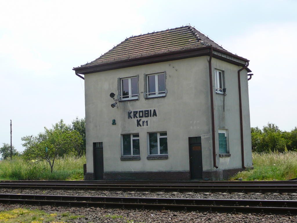 Krobia. Nastawnia Kr1; w lewo wyjazd w kierunku Kobylina/Krotoszyna i Miejskiej Górki, w prawo perony. Kierunek południowy.