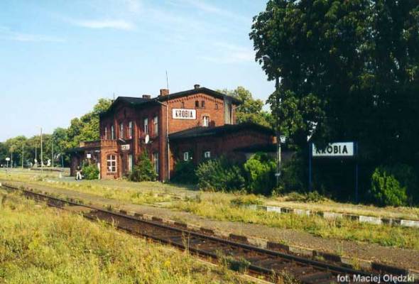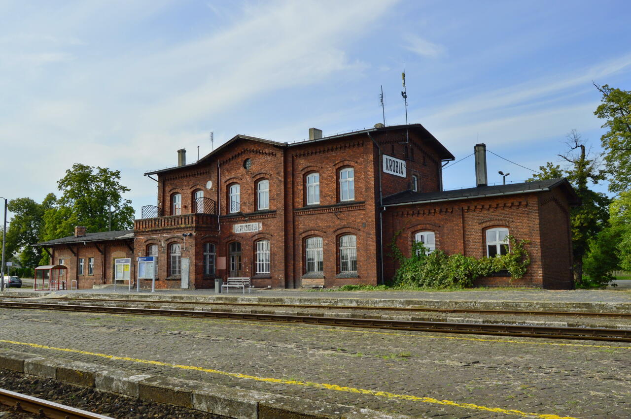 Krobia. Budynek dworca z przybudówką nastawni od strony peronów; w lewo Leszno/Kąkolewo i Gostyń, w prawo Kobylin/Ostrów Wielkopolski i Miejska Górka. Kierunek północny.