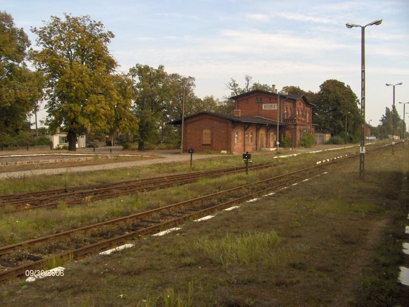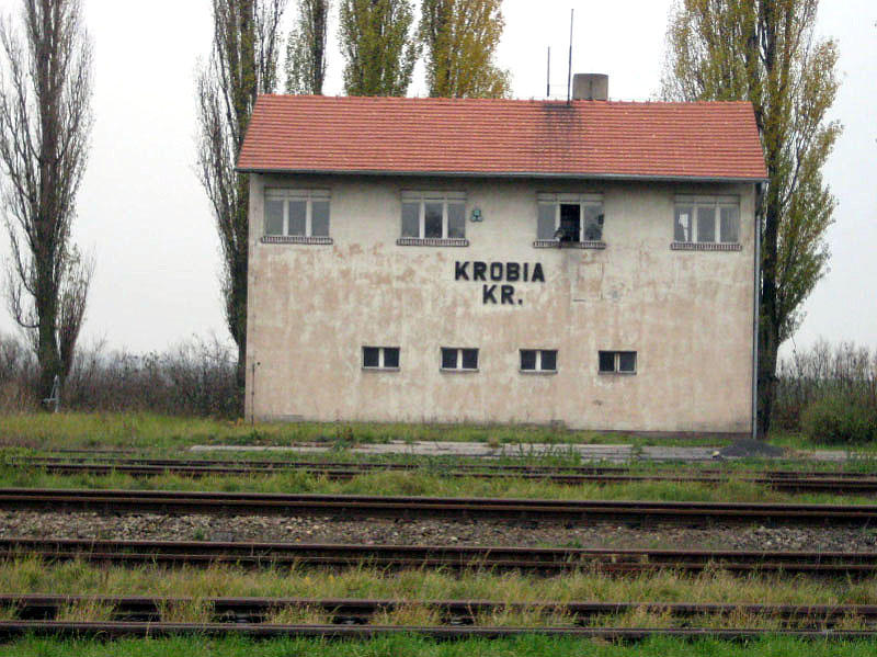 Krobia. Budynek dworca z przybudówką nastawni od strony peronów. Widok w kierunku północnym: w lewo Kąkolewo/Leszno i Gostyń, w prawo Kobylin/Krotoszyn i Miejska Górka.