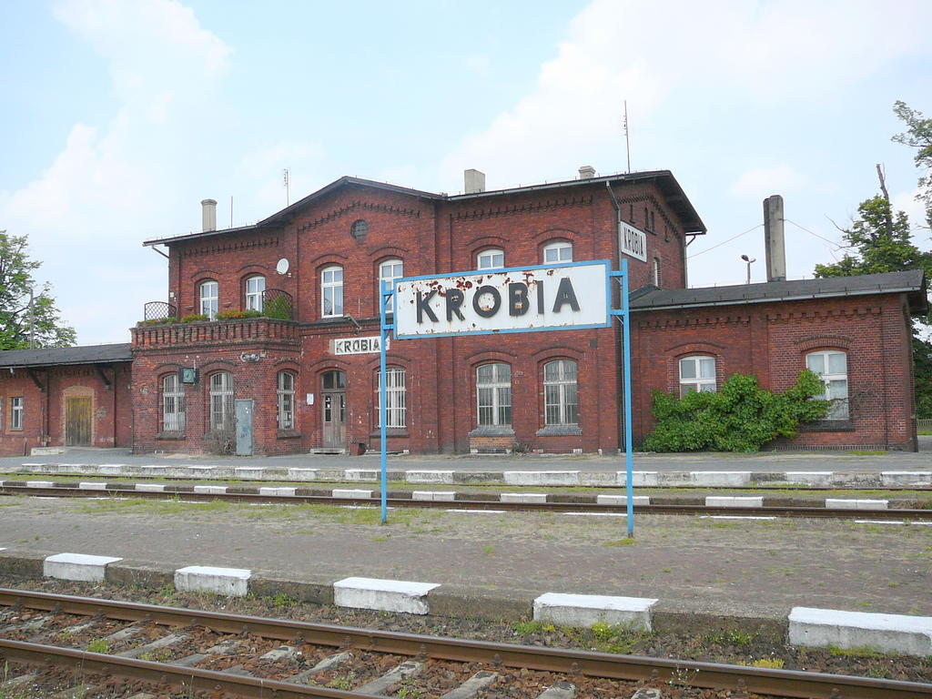 Peron 1 stacji Krobia. Po prawej budynek dworca PKP, po lewej pociąg retro Marcin relacji Wolsztyn – Krobia – Leszno – Poznań Główny organizowany przez IRiPK TurKol.pl. Widok w kierunku zachodnim (Kąkolewo/Leszno, Gostyń).