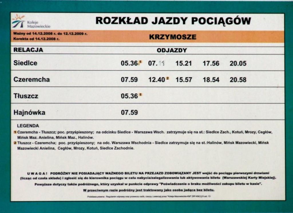 Opis ogólny: Przystanek w Krzymoszach jest obecnie drugim na linii Siedlce-Czeremcha/Hajnówka przystankiem. Położony na obrzeżach lasu przystanek przecina również droga prowadząca do Leśniczówki/Czurył i Zbuczyna. I właśnie ta droga czyni ten przystanek ciekawszym niż ten, który znajduje się w Stoku-Lackim. Na przystanku w pobliżu peronu, na którym zatrzymują się pociągi z Siedlec znajduje się budynek [wł. PKP] obecnie częściowo zamieszkały, pozostała część budynku zamknięta-opuszczona. Po pobieżnych jego oględzinach udało mi się znaleźć Poczekalnię, gdyż na peronach nie ma wiat. Istnienie poczekalni kojarzy się również z istnieniem kasy biletowej, ale to tylko moje domysły. Przystanek doczekał się własnego oświetlenia peronów w epoce gierkowskiej, nie wiadomo czy oświetlenie działa (nie sprawdzałem). Perony na przystanku zarówno w stanie technicznym jak i wyglądzie takie jak na przystanku w Stoku-Lackim. Z racji swojego położenia przystanek jest zabezpieczony sygnalizatorami swietlno-dźwiękowymi bez zapór informując "szybkich kierowców" o przejeździe pociągu. Przystanek ten jak wiele innych na tej trasie niegdyś tętnił życiem jak wynikało to z opowieści, jakie słyszałem i z obserwacji otoczenia. (info: SU45 2005-07-18) Opis budynków: Wcześniej część, prawdopodobnie kasę, zamieszkiwał emerytowany pracownik kolei z żoną. Poczekalnia zamknięta, nieużywana (stanowiła połowę budynku). Po śmierci małżeństwa rozebrano stojące nieopodal toalety, zdjęto z dachu eternit. Rozbiórka zatrzymała się do czasu wizyty geodety, ponieważ budynek był punktem geodezyjnym (?). (info: Krzysztof S, 06-06-2011) Po budynku nie ma już śladu. (info od: afmks, 2011-09-26). W 2017 roku w związku z remontem linii 31 przystanek odświeżony. Zabudowane nowe urządzenia SSP na przejeździe kolejowym (sama sygnalizacja), odświeżone perony, zabudowane nowe latarnie oświetleniowe, nowe ławeczki i tablice z rozkładami jazdy. |