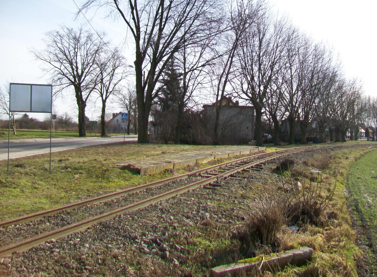 zadaszenie peronów: | Mała wiata przystankowa - charakterystyczna, z elementów betonowego płotu z dachem z blachy falistej. W 2013 roku w listopadzie jeszcze stała. (info: Adam Żmuda, 18-07-2014). | |