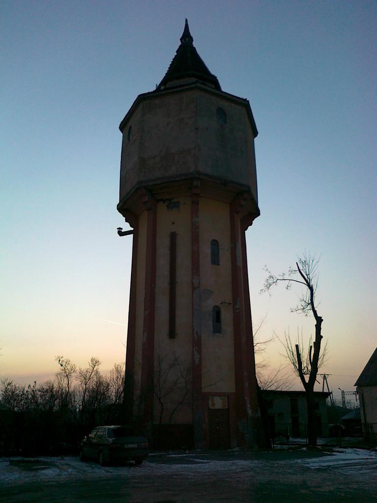 Wieża wodna w promieniach zachodzącego, zimowego słońca.