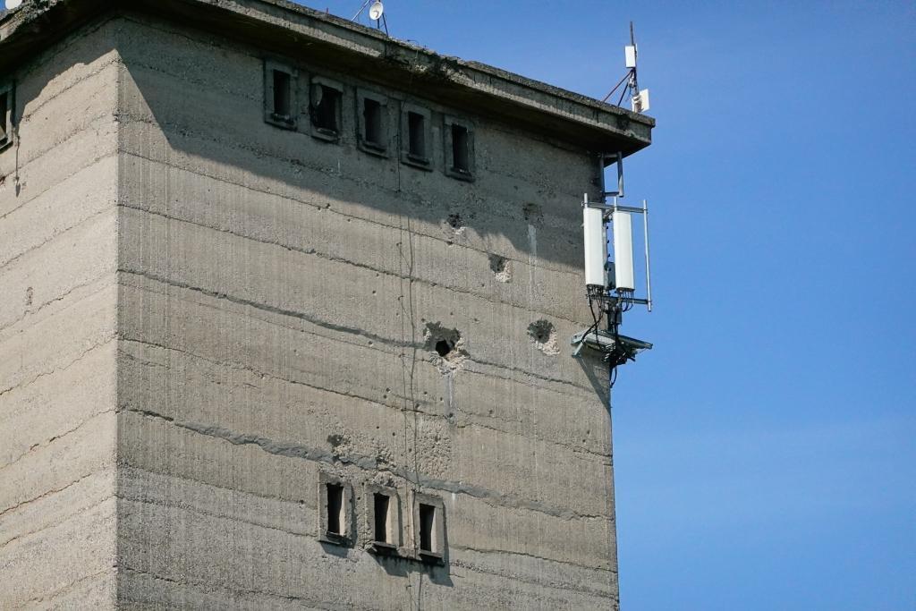 Na części zbiornikowej drugiej kolejowej wieży wodnej widoczne są wyrażne odpryski w murze - najpewniej pamiątka po II w.ś.