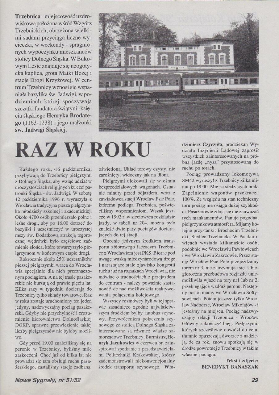 Lata temu byłem w Trzebnicy w ramach pielgrzymki z Wrocławia. Pamiętam, że przechodziliśmy przez wiadukt nad linią, wtedy jeszcze nieużywaną - lubo zadbaną. Szyny koloru brązu - ale szlak był przejezdny. Dziś zaś dzień w dzień kursują pociągi KD. Całe szczęście, że ktoś poszedł po rozum do głowy - w końcu szyny, podkłady oraz całą infrastrukturę kolejową w trudach zdrowia, czasem i życia - po coś budowano.