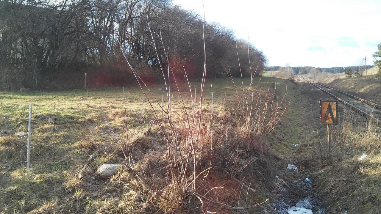W grudniu trwała wycinka drzew i krzaków wzdłuż linii, czyli prace przygotowawcze do prac remontowych, które mają rozpocząć się w 2016 roku. Widok od strony wjazdu z Czerwonego Boru/Ostrołęki.