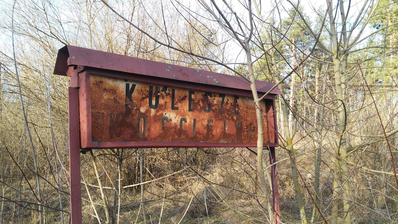 Tablica jeszcze jest, ale jeszcze dwa lata i będzie już całkiem zardzewiała i nieczytelna. Widoczny w oddali budynek to budka przy przejeździe kolejowym. Pociągi raczej już nie przejadą, ale "STOP" jeszcze stoi. Widok w kierunku Czerwonego Boru/Ostrołęki.