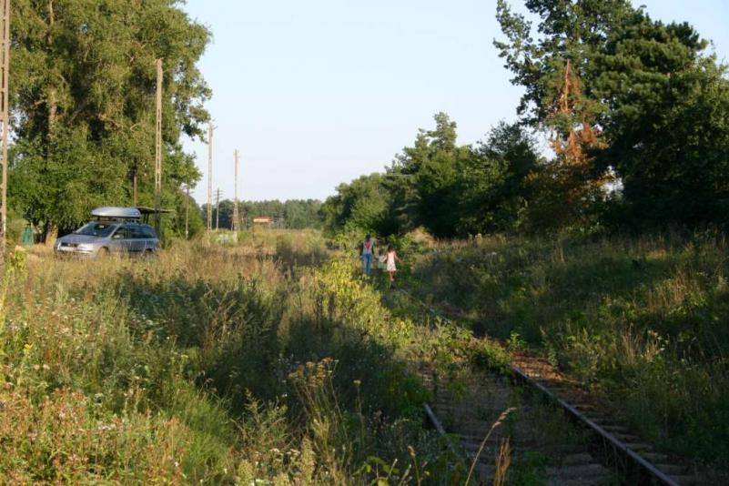 Kiedy kilka lat temu wsiadałam tu do pociągu, wyglądało to nieco inaczej. Co prawda była już tylko wiata i zarośnięty trawą peron, ale stacyjka wyglądała jeszcze przyzwoicie. Teraz przyszłam zobaczyć jak tu wygląda, kiedy pociągi przestały już tamtędy jeździć. Po torach można teraz tylko pospacerować. Na zdjęciu idę od strony Łap i pokazuję dzieciom szlak kolejowy, którego za kilka lat nie będzie już wcale widać.