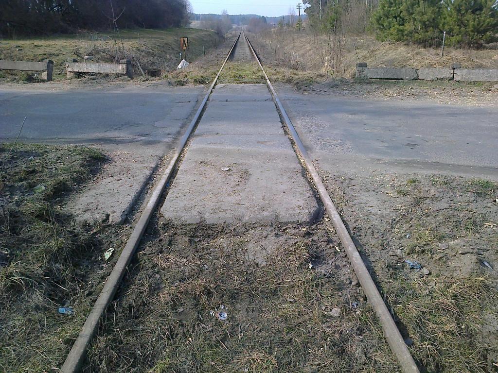 W grudniu trwała wycinka drzew i krzaków wzdłuż linii, czyli prace przygotowawcze do prac remontowych, które mają rozpocząć się w 2016 roku. W centrum kadru miejsce po rozebranej strażnicy przejazdowej i kasie, a później tylko kasie. Z prawej wyjazd w kierunku Czerwonego Boru/Ostrołęki.