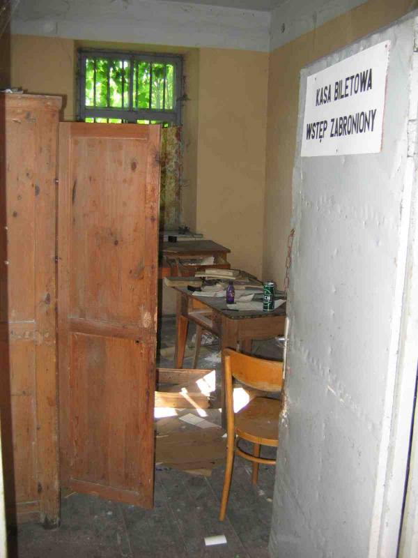 | Lipiec 2005 - krzaki bronią dostępu do budynku przystanku. A ten jest otwarty. W dawnej kasie wciąż stoją meble, wszędzie walają się sterty raportów kasowych, zestawień sprzedanych biletów, instrukcji o przewozie osób i towarów. Zdjęcie ślubne z lat 70-tych… W poczekalni - rozkład jazdy z 1992 roku. 4 pary pociągów. W pokoju obok - stare meble. Telewizor. Na regale leżą rodzinne fotografie. Świadectwo szkolne z 1955 r. Wszystko przykryte grubą warstwą kurzu i zupełnie opuszczone… (info: Marcin Kulinicz, 2005-07-04). |