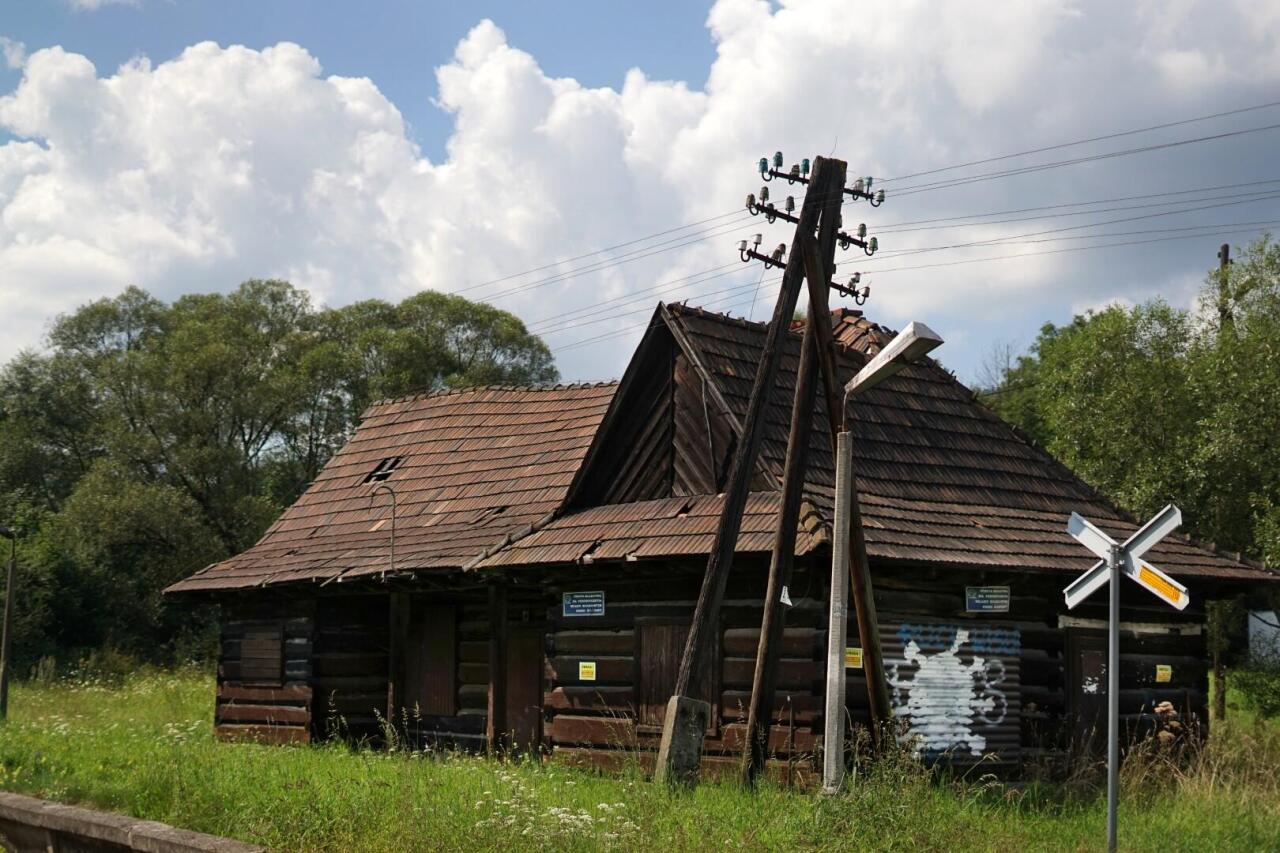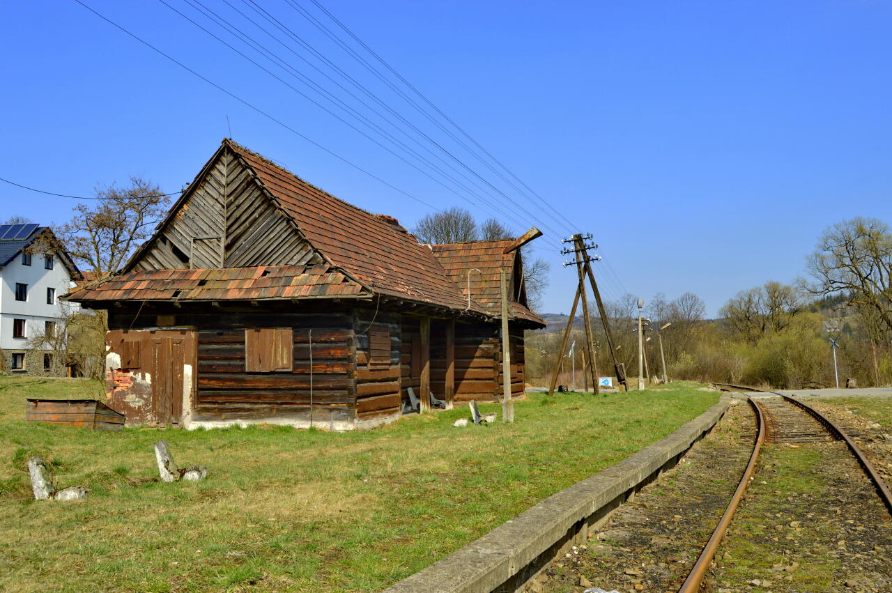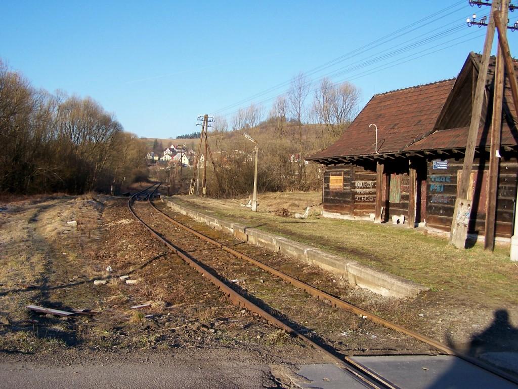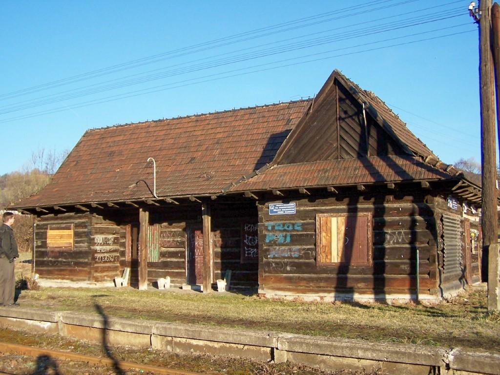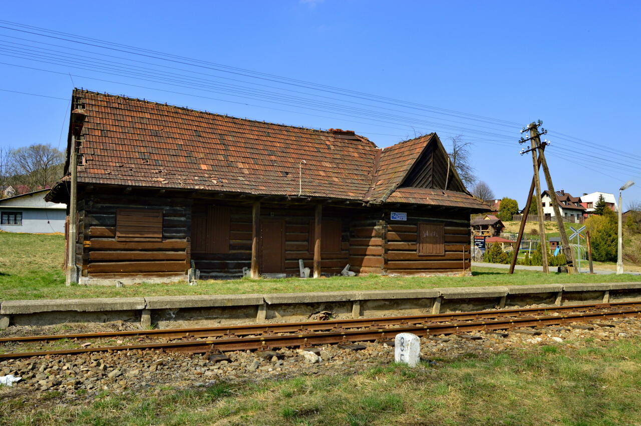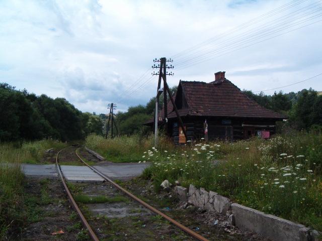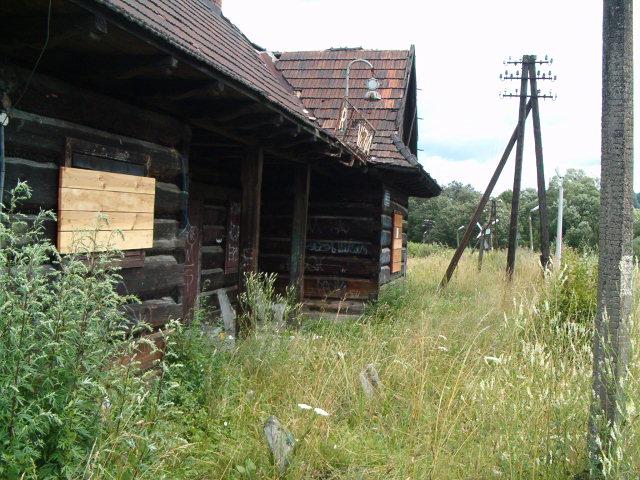 Nieczynny budynek dworca. Zbudowany został w czynie społecznym w roku 1948. W lewo Chabówka, w prawo Nowy Sącz.
