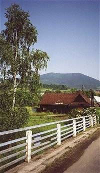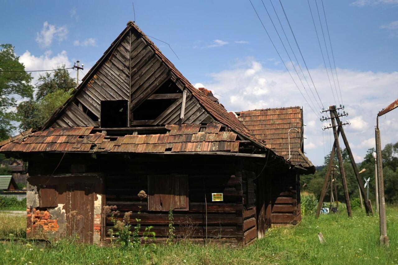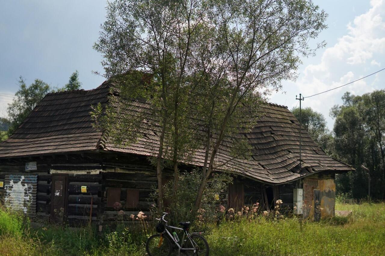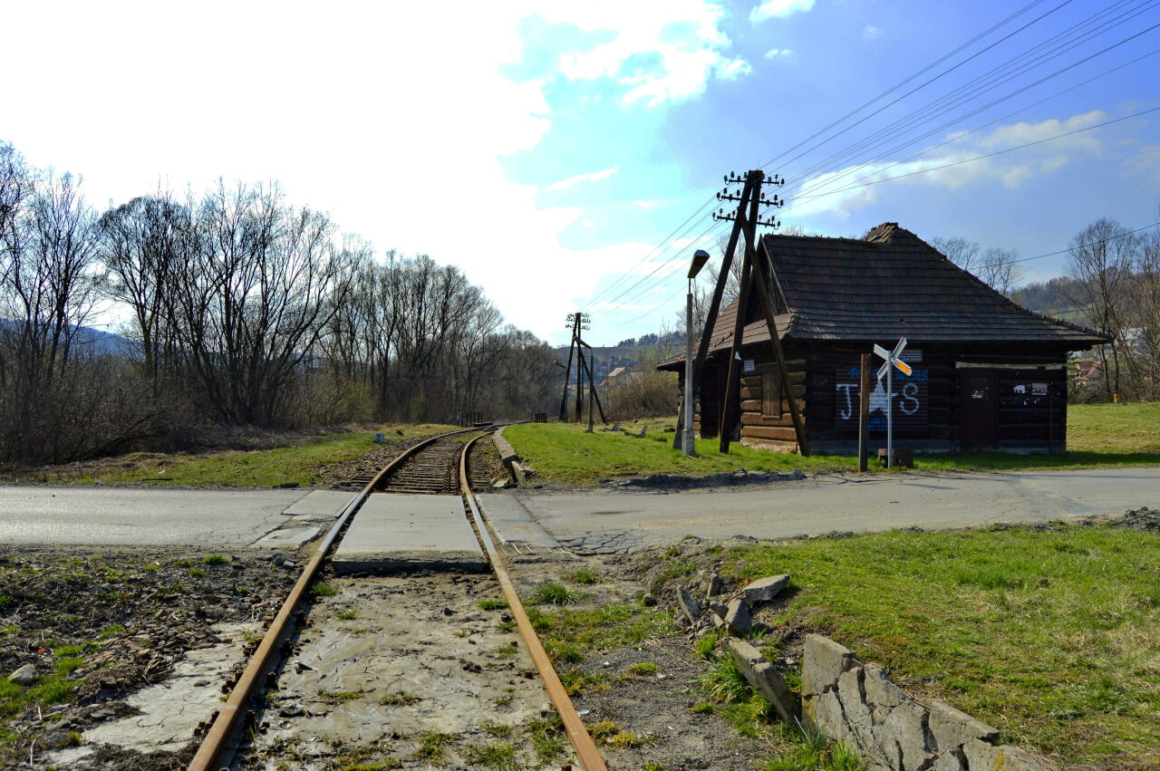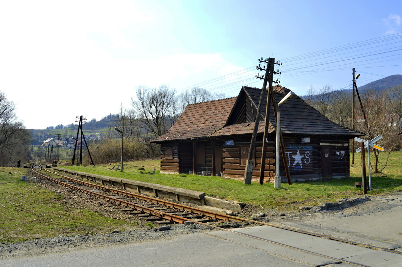 Nieczynny budynek dworca. Zbudowany został w czynie społecznym w roku 1948. W lewo Chabówka, w prawo Nowy Sącz.