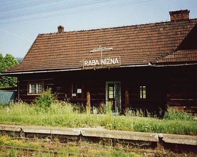 Raba Niżna. Budynek dworca od strony peronu. W lewo Chabówka, w prawo Nowy Sącz.