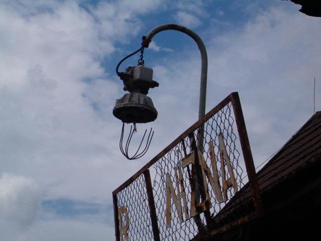 Tablica z nazwą przystanku wraz z oświetlającą ją latarnią na budynku dworca.
