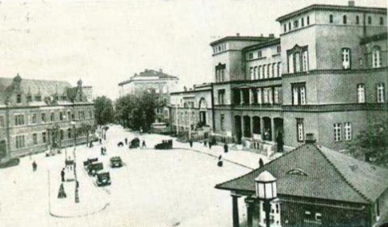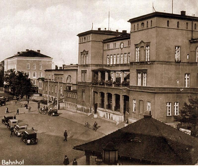Dworzec kolejowy od strony podjazdu. Obiekt zniszczony w 1945 roku przez armię czerwoną. Widok w kierunku wschodnim.