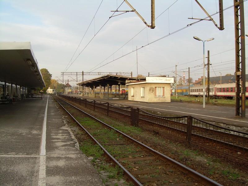 Racibórz - peron 2, z prawej peron 1 z budynkiem dworca. Widok w kierunku południowo-zachodnim, od strony wjazdu z Nędzy/Wrocławia.