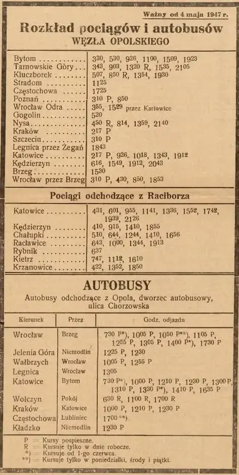 Rozkład jazdy pociągów z 1947 roku na stacji Racibórz.