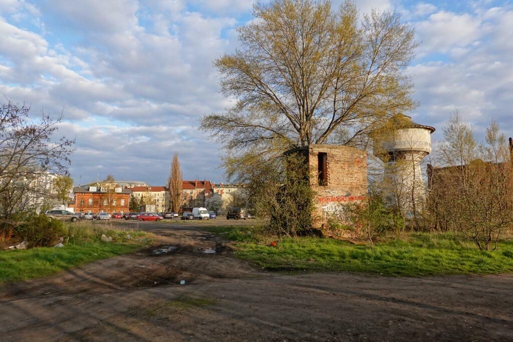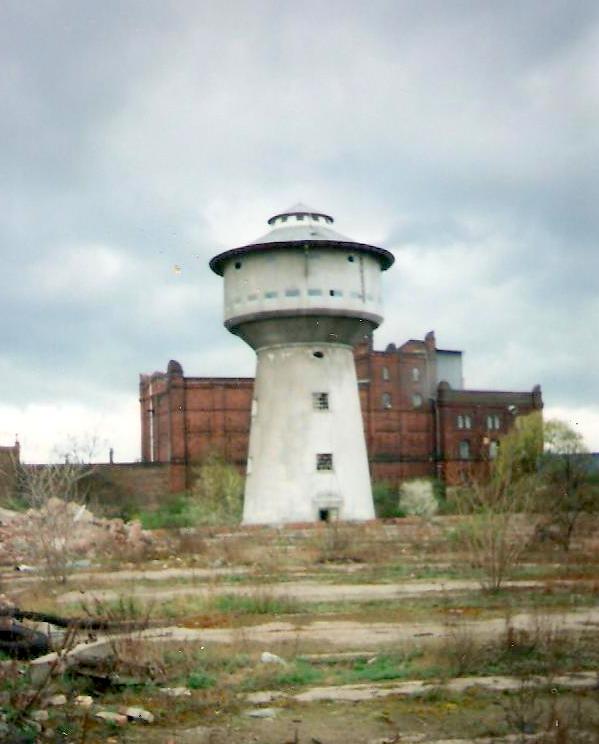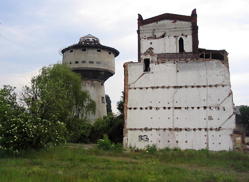 Wieża wodna przy ulicy Roboczej na tle dawnego młyna. Pusty plac z przodu to pozostałość po parowozowni.
